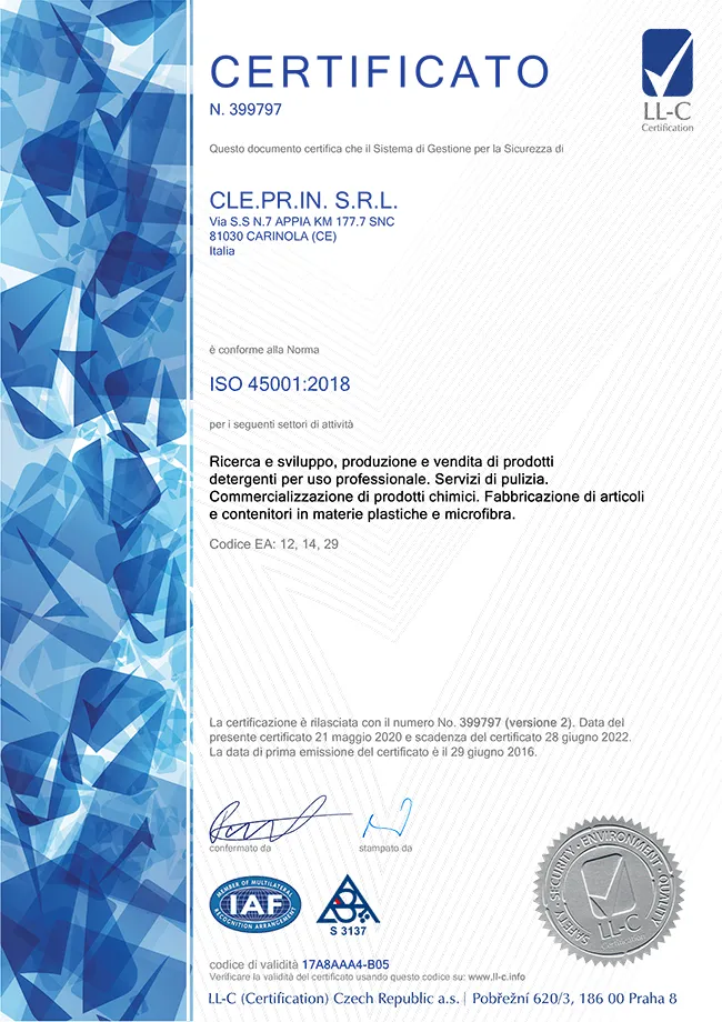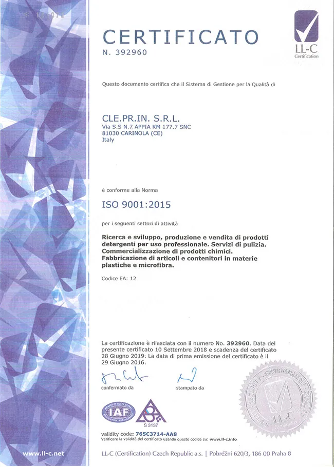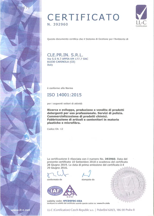 Certificazioni Sfoglia e consulta le nostre Certificazioni Cleprin si avvale da anni delle migliori certificazioni, per l‘ambiente, qualità e sicurezza. Ponendosi sul mercato come azienda leader del settore. Certificazione ISO 9001 Certificazione ISO 14001 Certificazione 45001 Certificazione B CORPORATION