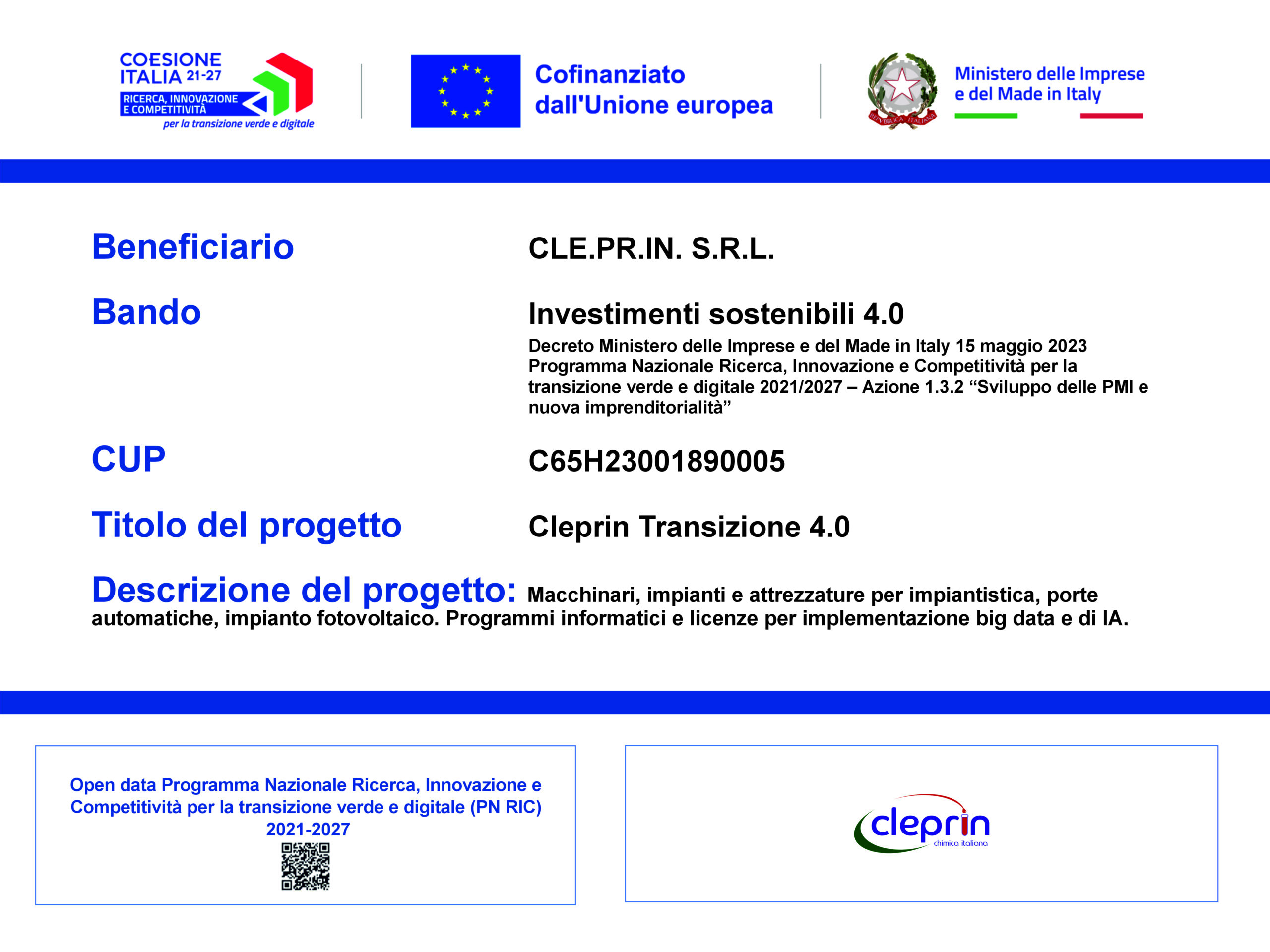 Dettagli Progetto Nome: Cleprin Transizione 4.0 Data: 15 Maggio 2023 Tag: Transizione 4.0 ALTRI PROGETTI Progetti verdi – Lo sviluppo sostenibile Sicurezza e Regolamentazioni Probiotici – realtà innovativa Fast – Il monouso sostenibile Cleprin Transizione 4.0 CLEPRIN TRANSIZIONE 4.0 Macchinari, impianti e attrezzature per impiantistica, porte automatiche, impianto fotovoltaico. Programmi informatici e licenze per implementazione […]