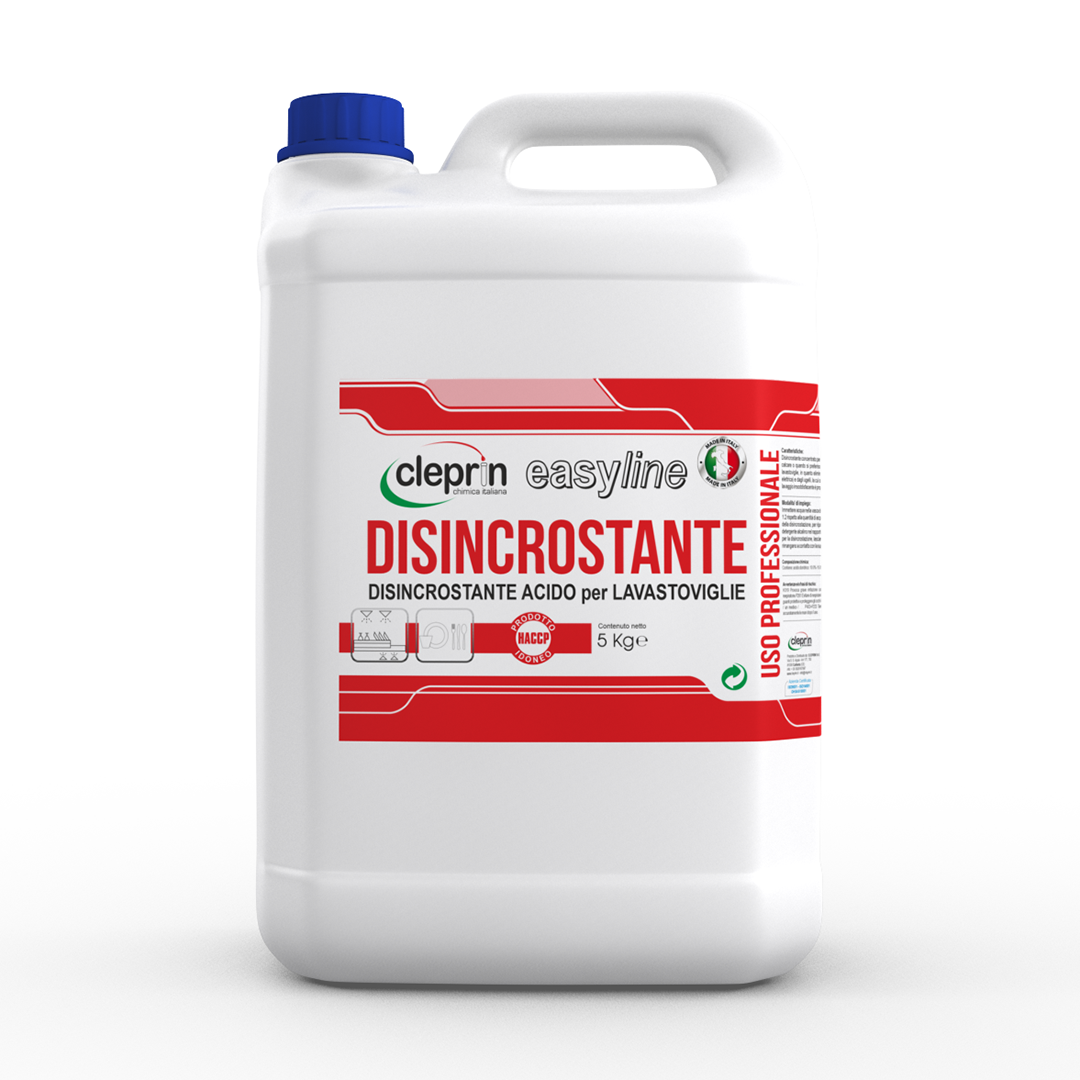 Disincrostante concentrato per lavastoviglie a base di acidi minerali ed inibitori di corrosione, da utilizzare in presenza di importanti incrostazioni di calcare o quando si preferisce l’impiego di una minore quantità di prodotto. È un prodotto indispensabile per la corretta manutenzione della lavastoviglie, in quanto elimina, senza corrodere, le incrostazioni di calcare dalle serpentine (che provocano un elevato consumo di energia elettrica) e dagli ugelli, la cui ostruzione è una delle cause principali di cattivo lavaggio della macchina. Il più delle volte, infatti, a determinare un lavaggio insoddisfacente è proprio la mancanza di un efficace disincrostazione.