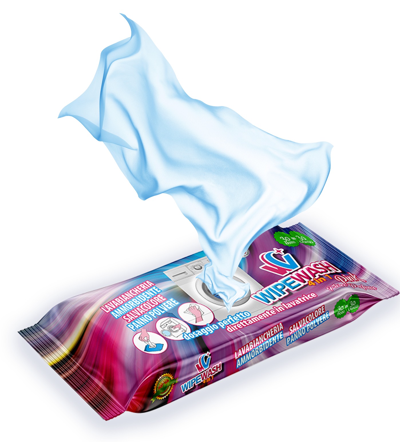 Il nuovo prodotto WIPEWASH racchiude in un unico panno 5 funzioni: lavabiancheria, ammorbidente, igienizzante, salvacolore, panno spolvero. Il prodotto impregnato su speciale panno spunlace è adatto ad ogni tipo di sporco, ridona il bianco naturale al bucato ed è adatto per capi colorati. Grazie alla sua formulazione lascia sui capi un fresco profumo di pulito, evitando il trasferimento del colore. Ogni panno corrisponde ad un lavaggio fino a 5 kg di biancheria, per quantitativi maggiori sono sufficienti due panni per lavaggio. Dopo l’utilizzo in lavatrice il panno può essere riutilizzato come panno per lo spolvero. La soluzione innovativa permette di ridurre sprechi d’acqua, dosaggi errati di prodotto ed è facile da utilizzare. L’obiettivo è quello di ridurre l’impiatto ambientale dei prodotti maggiormente utilizzati nel settore del cleaning.