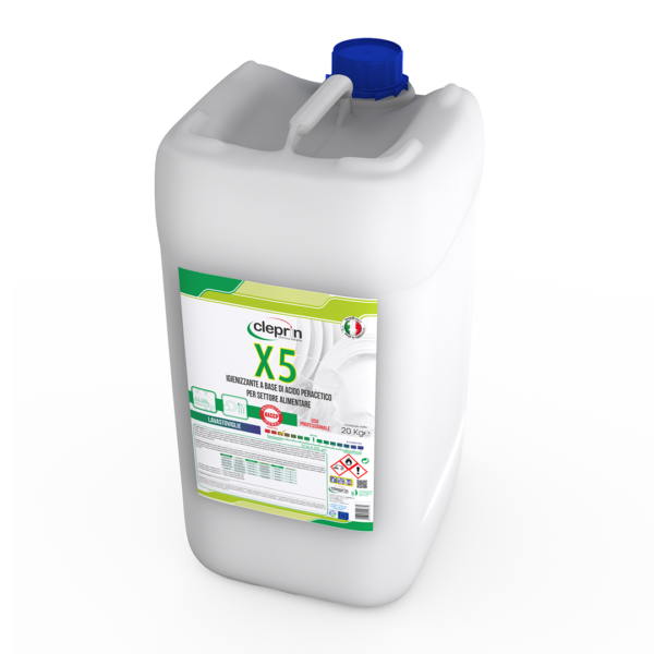 X 5 è un igienizzante per uso professionale costituito da un agente ossidante ad azione biocida efficace su un ampio spettro di microrganismi (batteri, virus, funghi, muffe, lieviti, alghe, elminti e spore). Agisce a bassa concentrazione ed a temperatura ambiente. Risulta ecocompatibile in quanto non contiene cloro o derivati clorurati. Senza colore, trova largo impiego nei processi di igienizzazione dell’industria alimentare. Può essere impiegato nella sanificazione di contenitori, linee, serbatoi , impianti C.I.P. e banchi da lavoro nell’industria di latte e latticini, della carne e delle bevande . Risulta particolarmente indicato nella sanitizzazione delle stoviglie (piatti e tazze in ceramica, bicchieri, utensili da cucina).